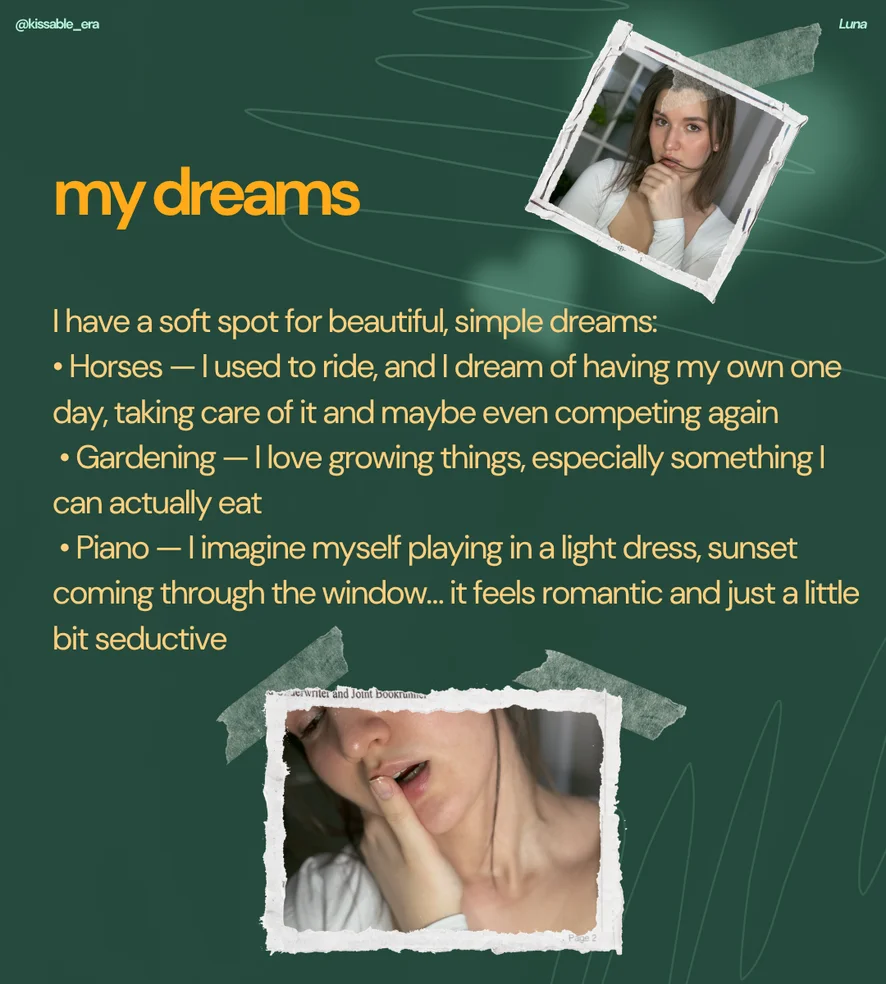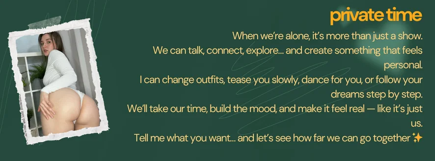 Ahegao, Camel Toe, Handjob, Flashing, Instrucțiuni pentru masturbare, Pantofi cu toc, Felație, Dildo sau Vibrator, Masturbare cu degetele, Nylon, Cowgirl, Evaluare Penisuri, Jucarii Sexuale, Striptease, Twerk, Anal show +666, Oil show + 500, Discutii murdare, Sex oral in adancime, Sex între sâni, Topless, Dans Erotic, Pe la spate, Masturbare, Masaj, Sub fustă, Footjob, Fetis Picioare, Plesnire, Jucării pentru sfârcuri, Anal, Jucării Anale, Orgasm, Spectacol cu ulei, Umilire